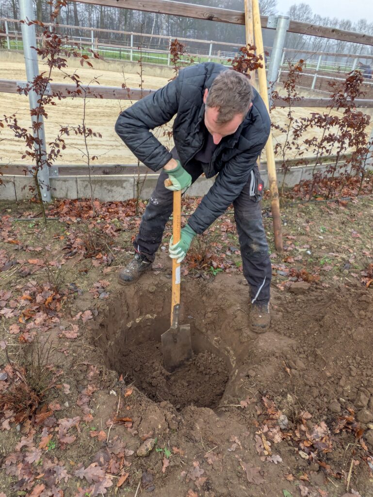 Am 4. Adventswochenende wurden nun durch einige Mitglieder des Vorstandes mit fachkundiger, für den gemeinnützigen Verein ehrenamtlicher Unterstützung des Lieferanten der Bäume, Rolf Schickhoff, die mit Hilfe der Fördergelder des Umweltschecks beschafften Bäume sowie eine Hainbuchenhecke gepflanzt. Bei den Bäumen wurden verschiedene alte Sorten heimischer Apfelbäume, wie z. B. Landsberger Renette und Elstar, sowie eine Winterlinde gewählt. Die Blüten sollen Nahrung für Insekten, liefern, die wiederum eine Nahrungsquelle für unterschiedliche Singvogelarten darstellen. Dabei wurde einerseits auf Bestäubungskompatibilität, andererseits aber auch auf unterschiedliche Blühzeiten geachtet. Während die Apfelsorte Elstar teilweise bereits Anfang April blüht, versorgt die Winterlinde die Insekten noch im Juli. Nach dem Pflanzen wurden dann die ersten Nistästen, die auf ihre Bewohner aber wohl noch etwas warten müssen, aufgehängt und die Vogelfutterstation auf der Terrasse vor dem Schulungsraum aufgebaut. Dabei hatte der Reiterverein mehr Nistkästen als ursprünglich gedacht zur Verfügung, da nach der Erwähnung des Projekts in einem Artikel der WN vom 9.10. ein vom Projekt begeisterter Saerbecker Bürger weitere Kästen, die er selbst gebaut hat, spendete.