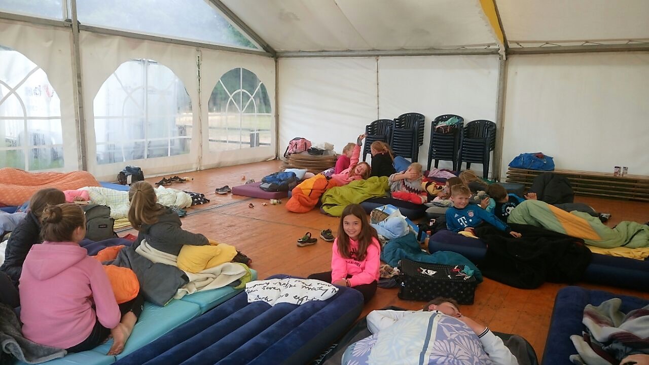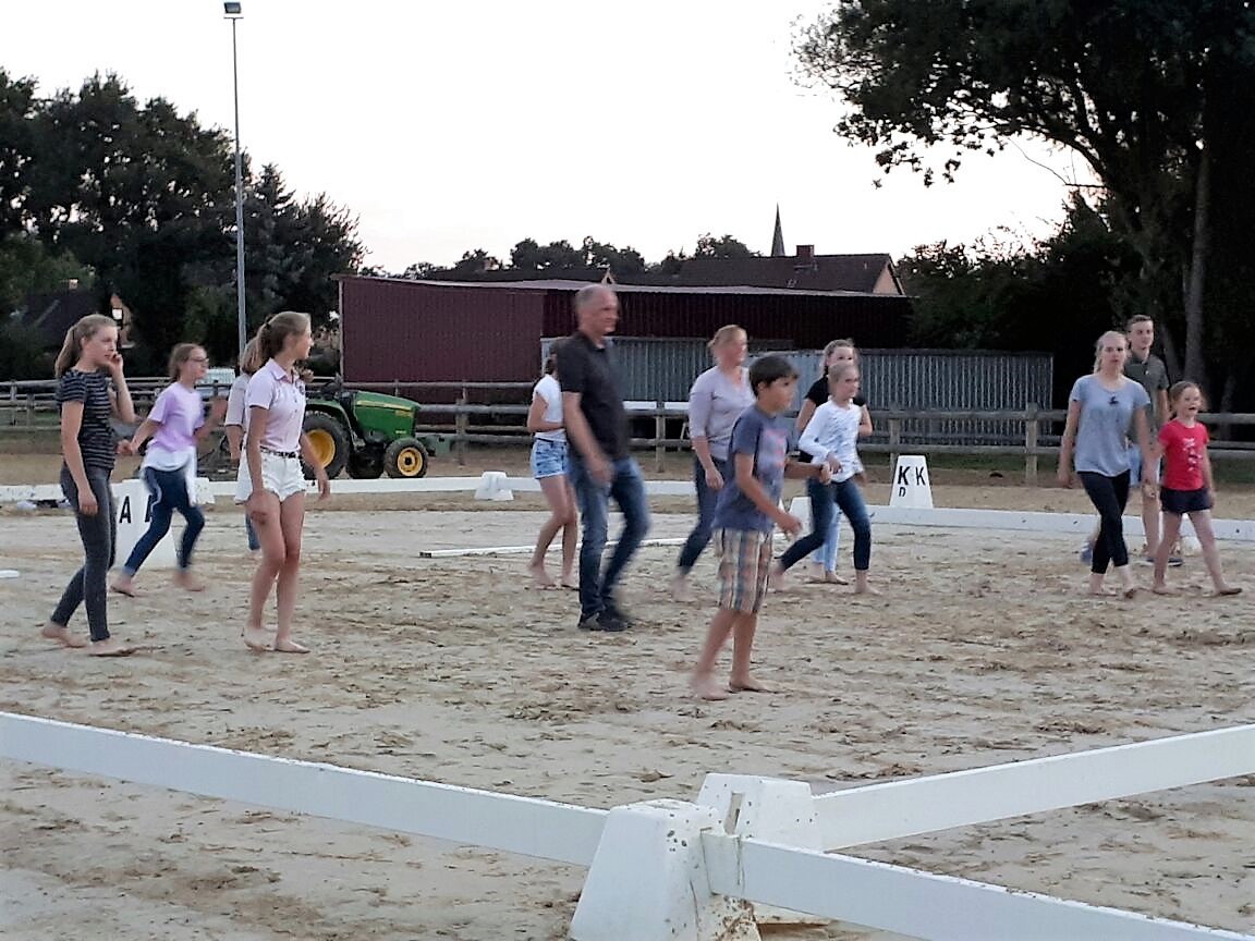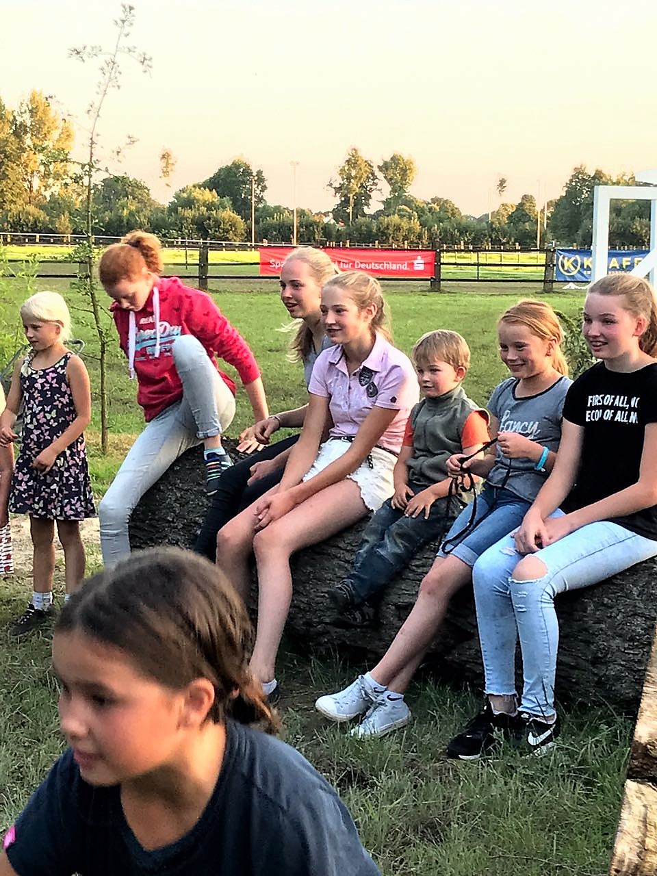Als die letzten Prüfungen unseres Sommerturniers vorbei waren und die externen Starter ihre Heimreise antraten, ging bei uns der Spaß erst richtig los. Das Dressurviereck wurde zum Völkerballfeld und im ausgeräumten Zelt auf dem Wall wurden die Schlafsäcke und Luftmatratzen ausgerollt. Was dies mit dem Reiten zu tun hat? – Wir nennen das Jugendförderung!